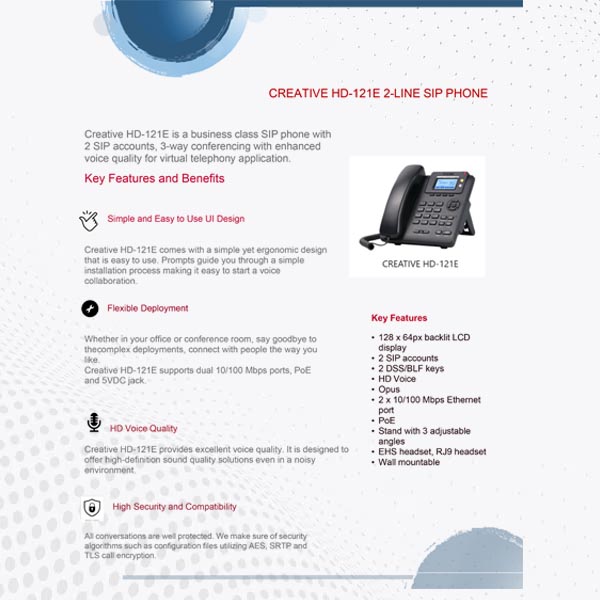 Creative HD-121E is a business class SIP phone with 2 SIP accounts, 3-way conferencing with enhanced voice quality for virtual telephony application.